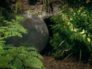 Exterior: The cave entrance is deep in a wooded area. The entrance to the gave is blocked by a large round stone, which Ares presumably rolled away with his powers as Mila approached.