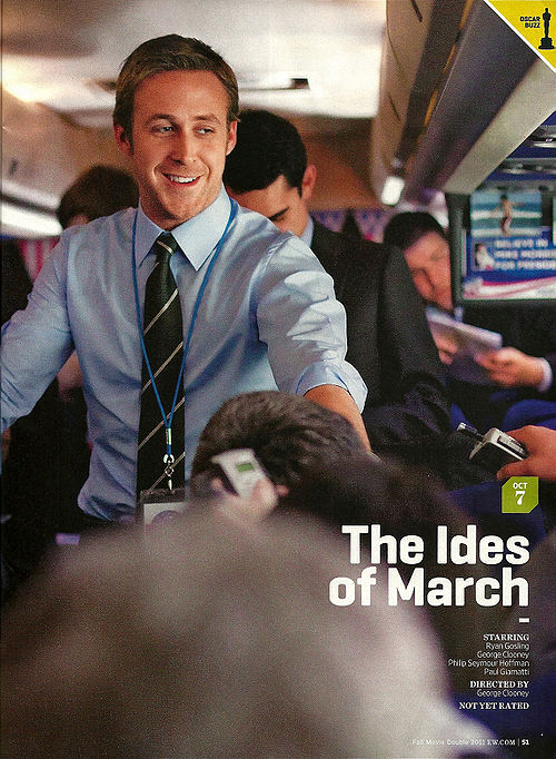 The Ides of March is not the sort of movie likely to lift the spirits of a president who's already got plenty of problems on his plate. Part morality tale, part thriller, Ides offers an unflattering warts-and-all look inside the machinery of a presidential campaign, exploring the lengths people will go to in order to attain power, even at the cost of everything they say they hold dear. Ryan Gosling stars as Stephen Meyers, and idealistic young media strategist working for Gov. Mike Morris (Clooney), a rising Democratic star battling for his party's nomination. When Myers learns that Morris has a secret that could destroy his campaign (don't worry, we won't spoil it), he's forced to choose between his highest values and his desire to win, whatever it takes. "I don't really find it to be a movie about politics," says Clooney, who co-wrote the script - based on Beau Willimon's play Farragut North - with producing partner Grant Heslov. "It's about a guy going anything to win at the cost of his soul. Those are universal themes you could play with in any genre or in any workplace. It's just that the political arena is so much fun to work in."